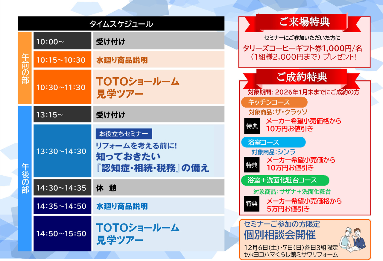 開催日時 | 11/8(土)9(日) 午前の部 10:15~ 受け付け10:00~ 午後の部 13:30~ 受け付け13:15~ 午後の部 13:30~14:30(お役立ちセミナー) |