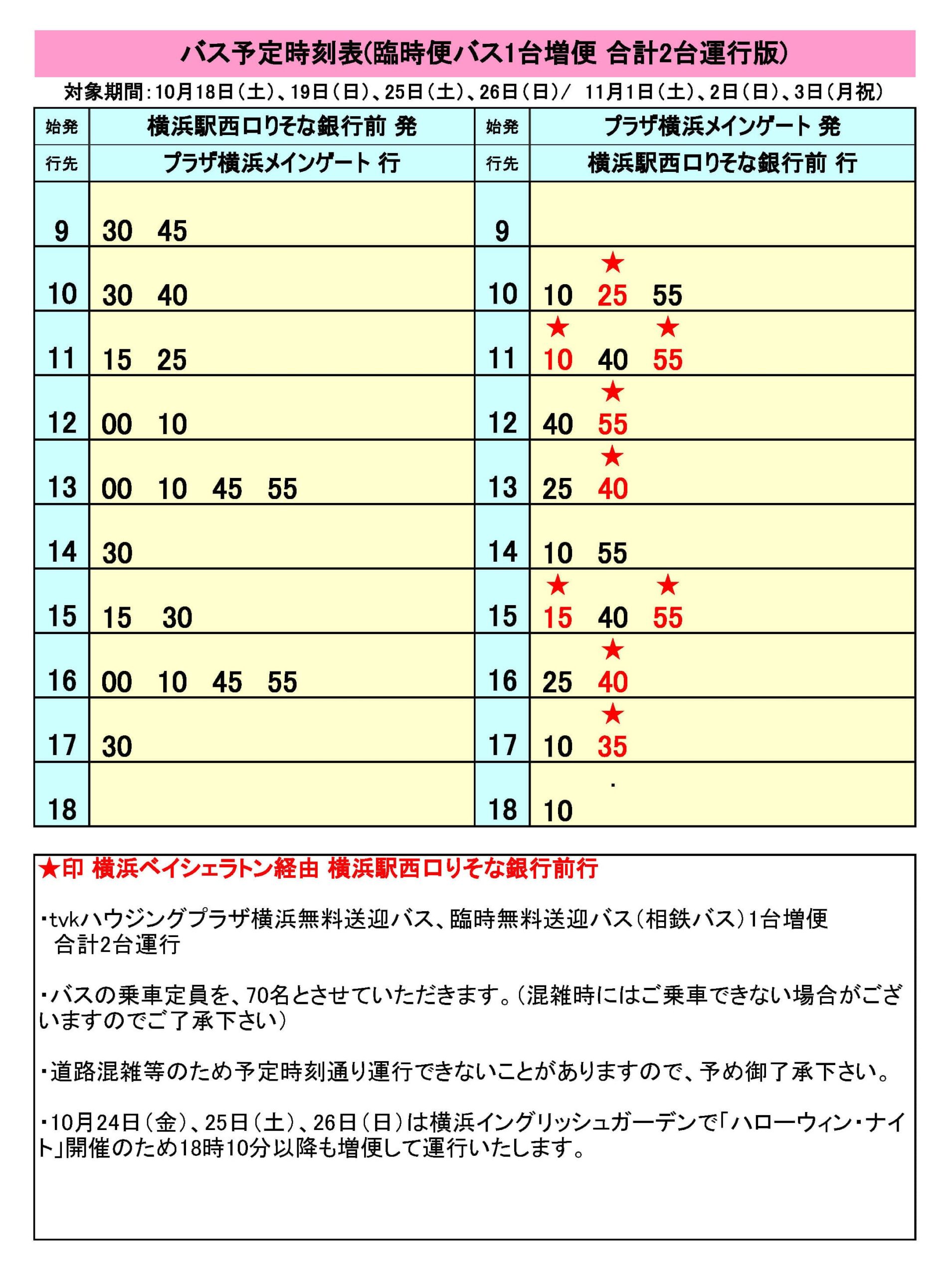 ※「南ゲート」「横浜イングリッシュガーデン」「ザ・シーズンズ」 の各バス停には停車いたしませんのでご注意ください。 - 通常、水曜日の送迎バスは運休ですが、10月22日(水)、